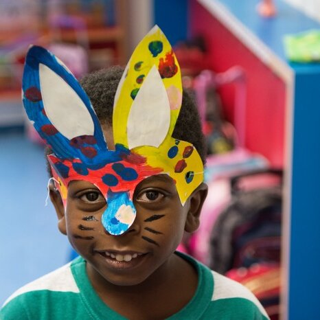 Als der Tag der Feier endlich, endlich gekommen war, konnte die unruhige, aufgeregte Schar kaum gebändigt werden! Nachmittags wurden die selbstgebastelten Masken aufgesetzt, das Hasengesicht durch zusätzliches Schminken vervollkommnet und die Erklärungen gegeben, wie die auf dem Gelände versteckten Ostereier zu suchen und zu finden seien. Es gab fast kein Halten mehr, auch wenn von vornherein klar war, dass jeder nur ein Ei bekommen würde! Nach einer Art Schnitzeljagd, die die Zwerge zu den Eiernestern führte und alle erschöpft fündig geworden waren, gab´s zur Feier und zum Abschluss des Tages Kuchen, Limo und weitere Leckereien für alle. Es war der perfekte Einstieg für´s lange Osterwochenende!